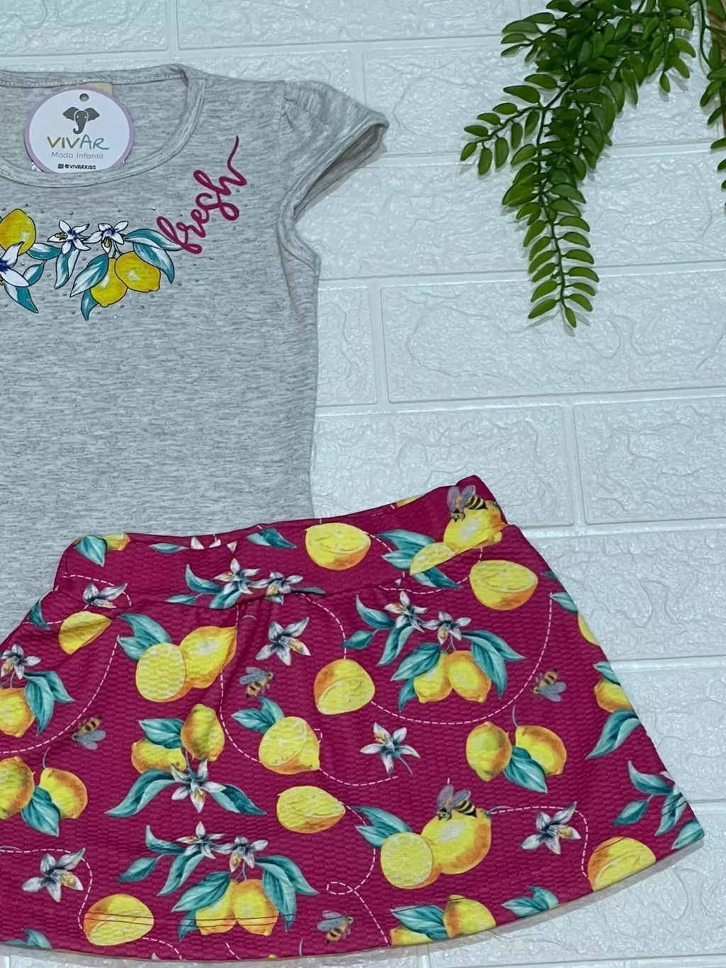Conjunto com blusa de cotoon com detalhes, e saia com shorts cotton super macio e confortável, mais verão impossivel, lindo, leve, macio e prontissimo para brincar muito com ele.