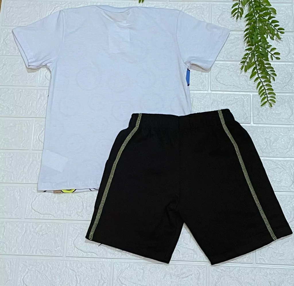 Conjunto super divertido e alegre, 100% alodão, camiseta meia malha e bermuda em moletinho.